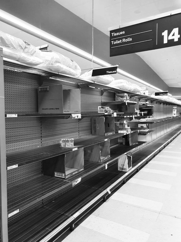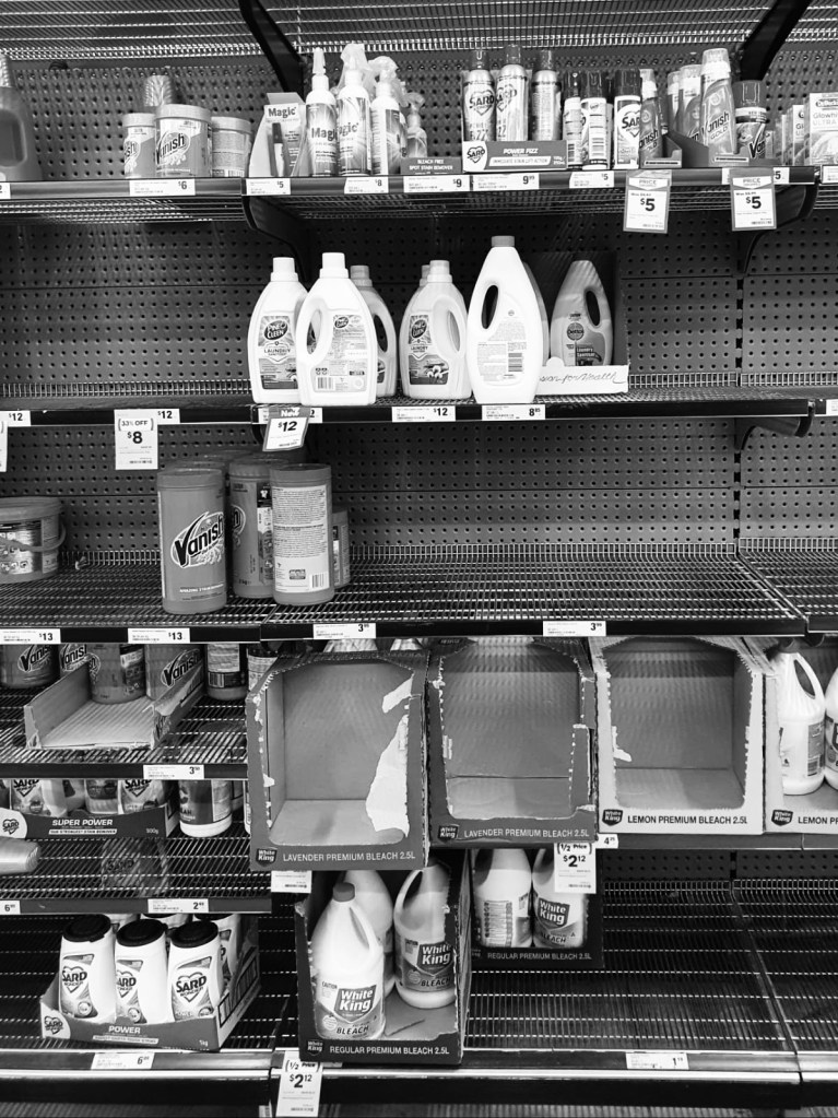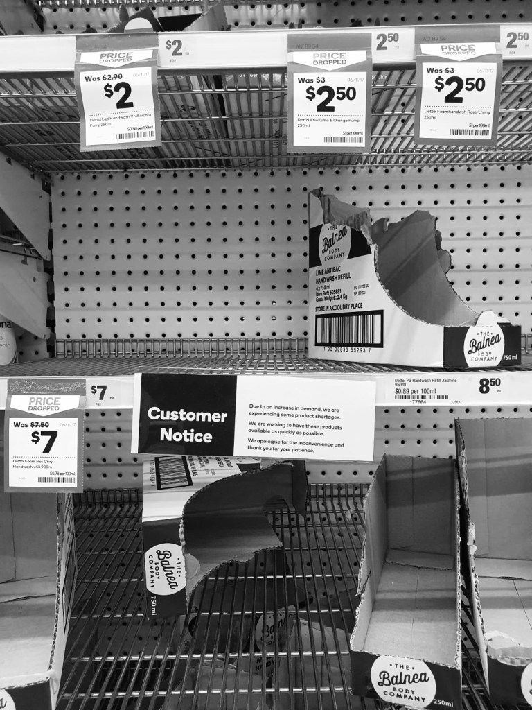 This triggered Australians to panic buy, and in response, Woolworths rationed toilet paper. Food was also a target, as were other items including hand sanitiser and wipes.