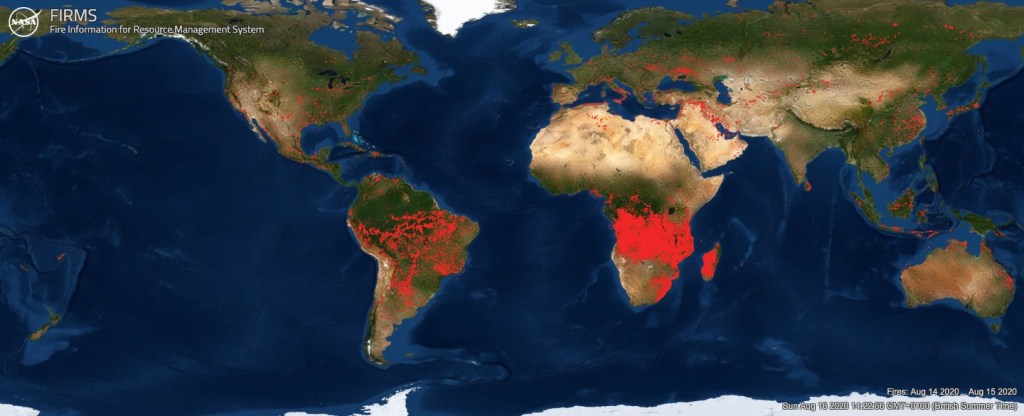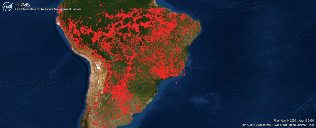 Nasa’s FIRMS system (Fire Information for Resource Management System) is an open-source data capture system used for monitoring fires in real-time, including the Amazon (pictured below).