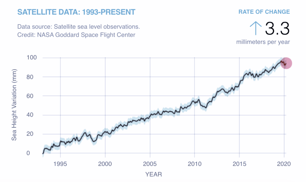 Glacial land melting is a key contributor of sea-level rise and is estimated to increase by 70 metres if all ice caps and glaciers recede into the oceans. NASA data, which has measured oceanic changes since 1993 has calculated sea level rise over the past year alone to be 3.3 mm.